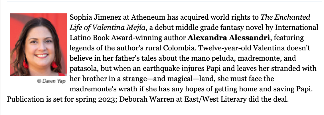 As if that wasn’t enough good news, the announcement for my debut middle grade novel went live! I get to continue publishing books for kids, this time for ages 8-12! The middle grade fantasy will follow twelve-year-old Valentina Mejía and her brother as they discover that all the legends from their dad’s stories are true in their attempt to get back home and save Papi.