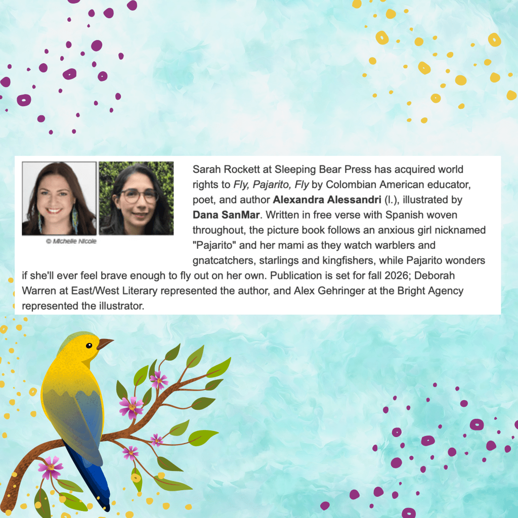 Sarah Rockett at Sleeping Bear Press has acquired world rights to Fly, Pajarito, Fly by Colombian American educator, poet, and author Alexandra Alessandri (l.), illustrated by Dana SanMar. Written in free verse with Spanish woven throughout, the picture book follows an anxious girl nicknamed “Pajarito” and her mami as they watch warblers and gnatcatchers, starlings and kingfishers, while Pajarito wonders if she’ll ever feel brave enough to fly out on her own. Publication is set for fall 2026; Deborah Warren at East/West Literary represented the author, and Alex Gehringer at the Bright Agency represented the illustrator.